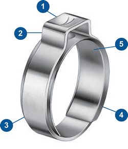 nr.2 System OETIKER: (ucho z dołkiem): Zapewnia odpowiednio niski profil zamkniętego ucha oraz naturalną sprężystość zacisku, umożliwiając rozszerzanie się i kurczenie podczas pracy w zmiennych warunkach termicznych.